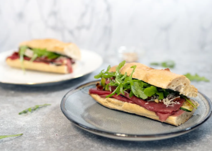 Broodje rosbief, rucola, kappertjes, zongedroogde tomaten, kruidendressing en bieslook