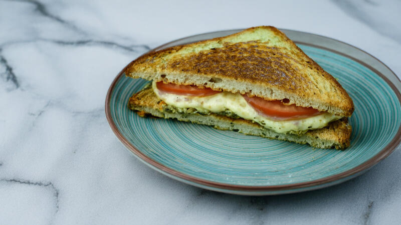 Italiaanse tosti met mozzarella. pesto en tomaat